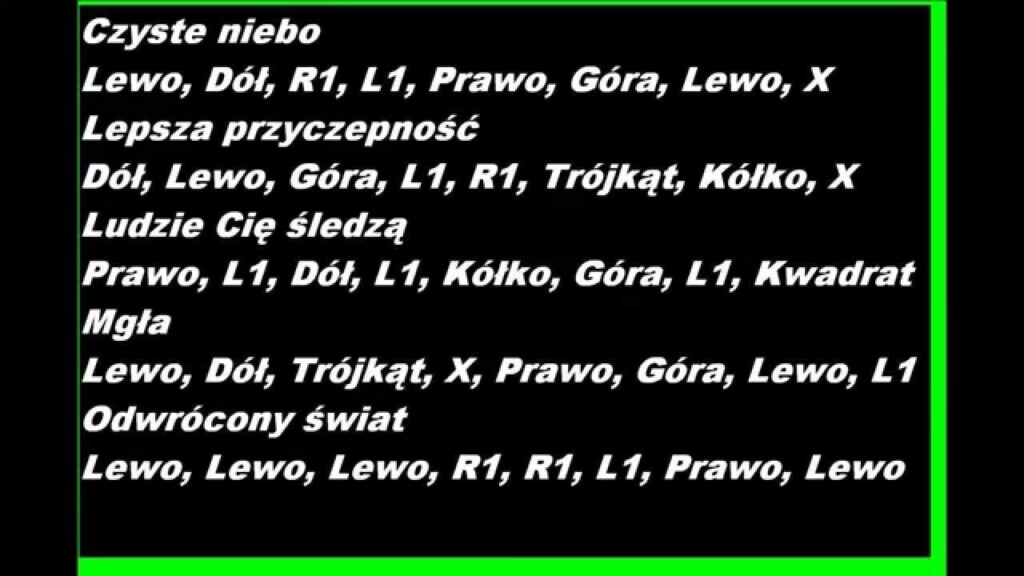 | Wszystkie pojazdy stają się czarne | L1, R1, L1, R1, Lewo, Kółko, Góra, X |